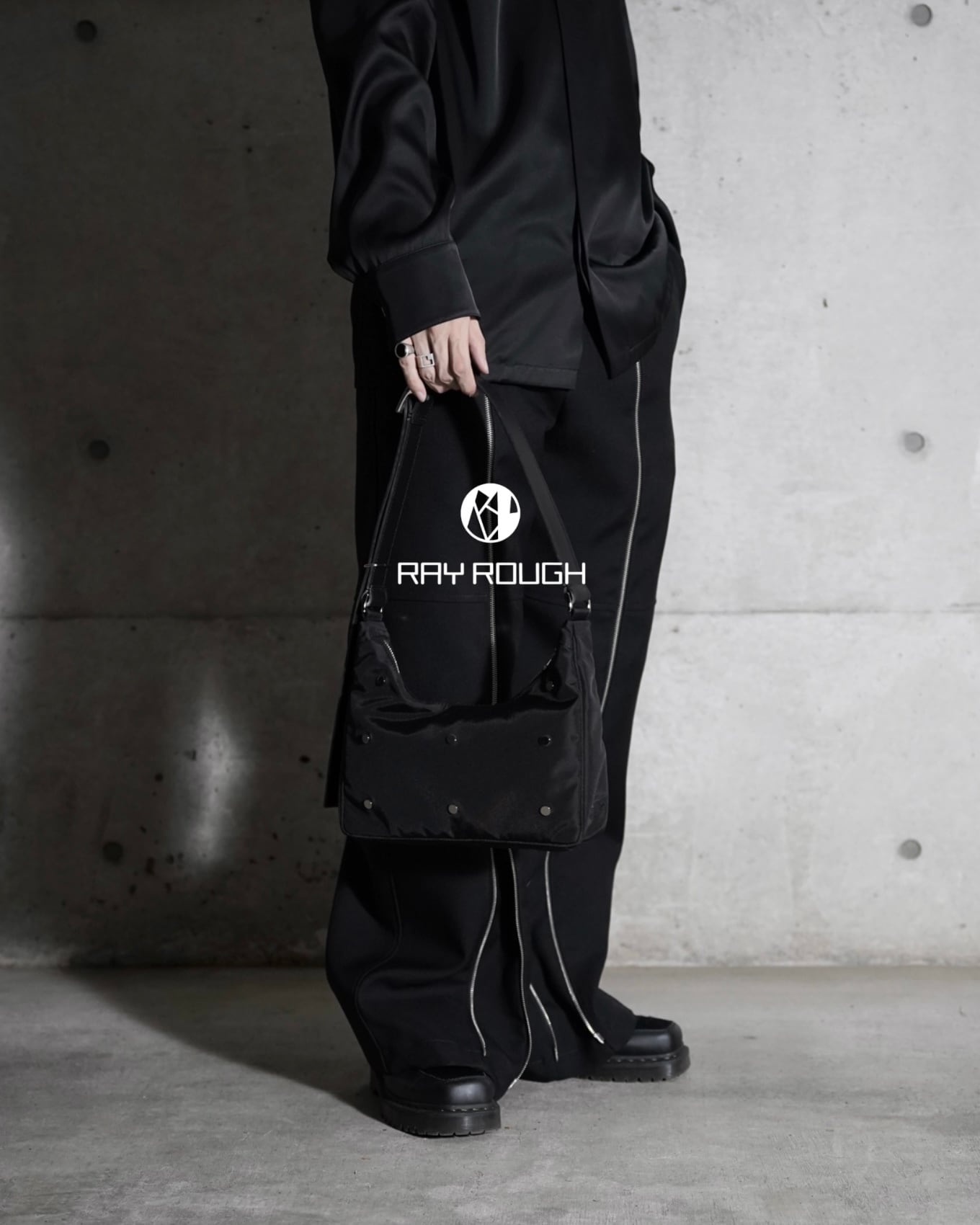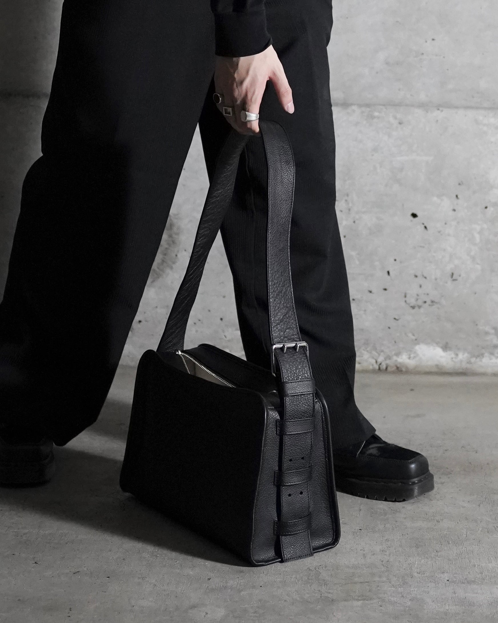 ◾︎"frame"(フレーム) ボディには一般的に使用されるナイロンの数倍の堅牢性を持つコーデュラを全面に使用。 ベルト部は最高級の牛本革を使用しております。 内装にはファスナー付きポケット。 肩にかけてもそのまま持っても。 ◼︎size h200 w280 d80